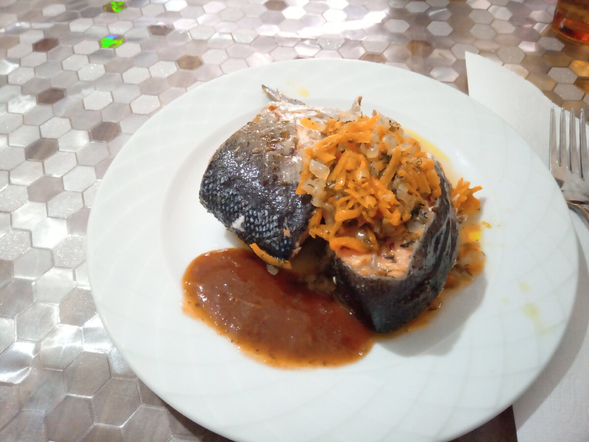 Разогреваем две плоские сковороды. На одну выкладываем готовое филе рыбы,приправленное лимонной солью и перцем и обжариваем,чтобы закрепить сок рыбы. На второй обжариваем до мягкости репчатый лук и тёртую морковь. Можно добавить зелень. Когда лук с морковью готовы,выкладываем на них обжаренную рыбу. Сок от нее тоже выливаем. Можно приправить розмарином... ,Наливаем совсем чуть воды и накрываем крышкой. Томим минут 20. Отключаем и оставляем на плите закрытой ещё на несколько минут. P.S- Вам будут доступны все мои рецепты при подписке ..