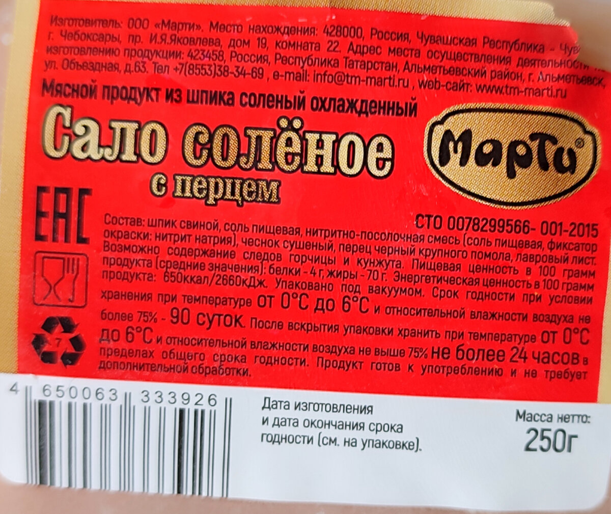 Всём привет! Сварил борща и что-то захотелось к борщу сала вприкуску. С чесночком, горчичкой. Самому солить достаточно долго, а хотелось здесь и сейчас, поэтому пришлось брать в магазине. В последнее время цены на сало выросли и доходят до 1000 рублей за килограмм. Но в магазине Красное и белое попался на глаза интересный вариант. 139 рублей за 250 грамм. Получается 556 рублей за кг, вполне адекватная цена. Вот такое солёное сало с перцем. Изготовитель "Марти", г. Чебоксары. Состав нормальный. Срок годности тоже. Такой достаточно аппетитный кусочек. С хорошей мясной прослойкой. По весу тоже всё чётко, хотя на вид он казался меньше чем 250 грамм. На вкус оказалось не так хорошо как на внешний вид. Для меня сало показалось очень пересоленым. И не совсем хорошо жевалось. Свинка была не молодая. Сало своего посола конечно вкуснее. В принципе за такую цену нормально думаю. Кто пробовал как вам? Всём приятного аппетита! Подписывайтесь на канал, чтобы не пропустить новые обзоры и