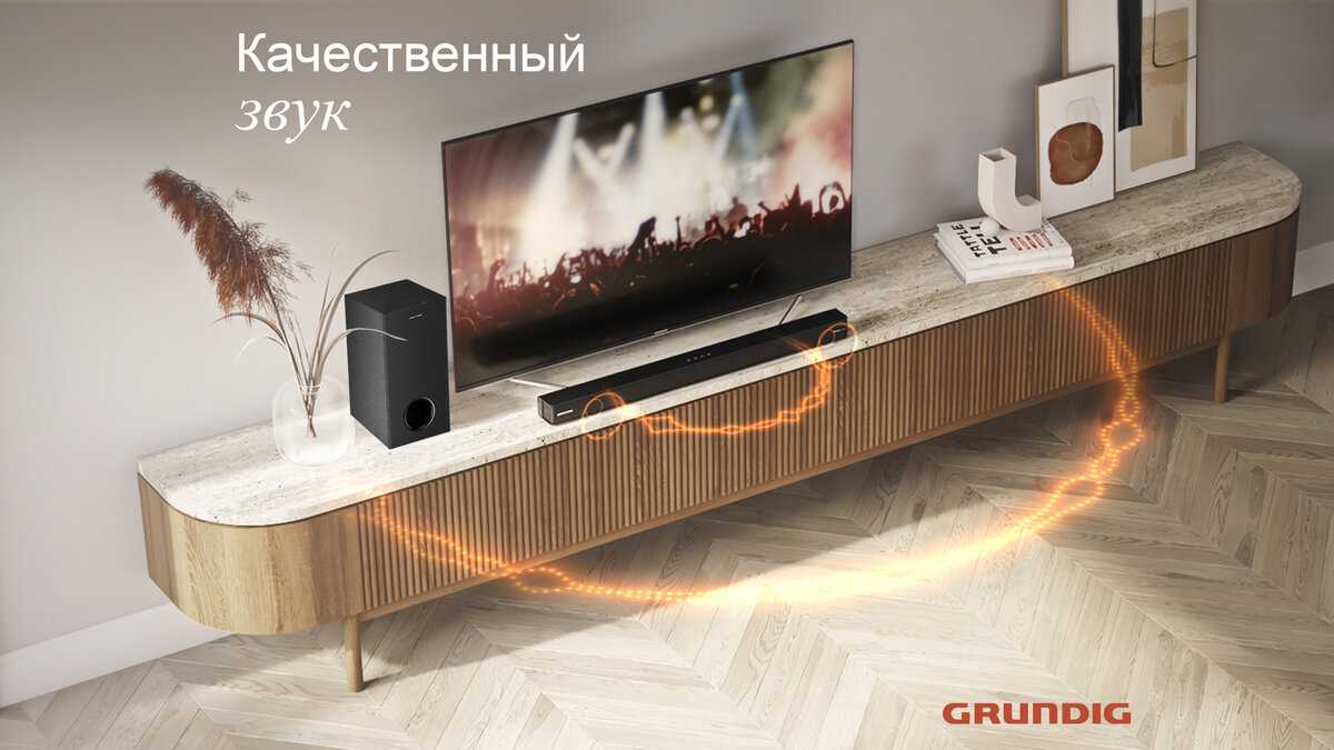 Важное преимущество саундбара в том, что он не занимает много места — это выгодно отличает его от полноценного домашнего кинотеатра. Например, Grundig DSB 2100 состоит из компактной звуковой панели и беспроводного сабвуфера. Небольшой и стильный, он украсит собой гостиную, заняв минимум места на телевизионной полке или на стене.