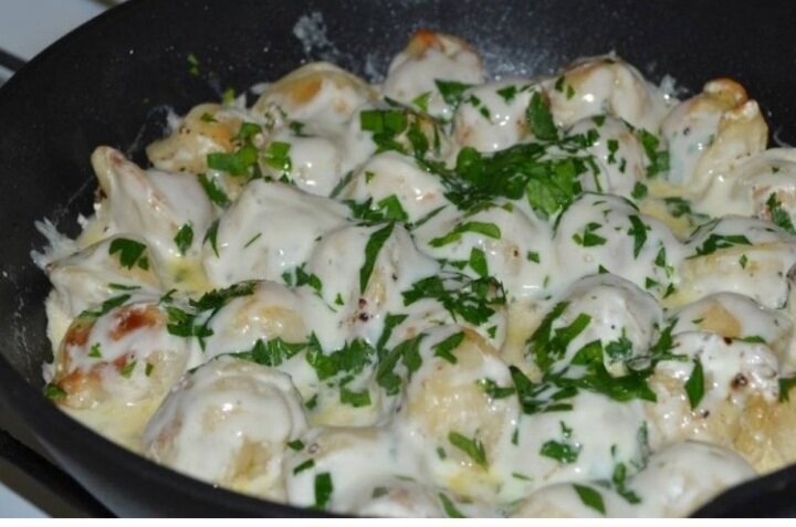 Популярное русское блюдо готовится довольно часто. У каждой хозяйки есть свой особенный рецепт, с учетом пожеланий и вкусовых предпочтений семьи. Предлагаем сегодня отойти от привычных вариантов и приготовить жареные пельмени на сковороде. На разогретую сковороду с маслом всыпь замороженные пельмени и обжаривай их 10 минут. Лук мелко нарежь и всыпь в сковородку. Через 3 минуты добавь кипяток, соль, молотый перец и сметану. Готовь 10 минут под крышкой .