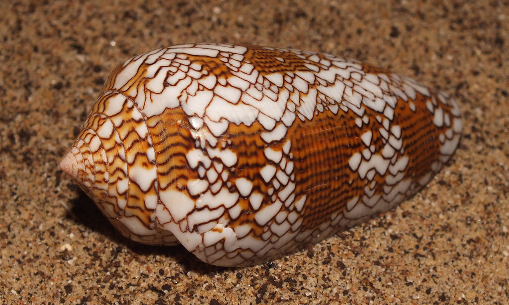 Знакомьтесь, перед вами географический конус (Conus geographus). Эта улитка родом из тропических и субтропических вод Индо-Тихоокеанского региона. Селится она возле коралловых рифов или песчаных районов. Встречается также в зоне приливов и отливов.