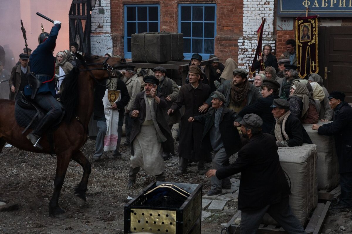 «Снимается стачка и жандармы, которые эту толпу разгоняют, урезонивают. Четыре всадника и пешие каскадеры, находящиеся в гуще событий. Именно с ними и происходит взаимодействие каскадеров на лошадях. Также они выполняют и определенную роль страхующих, потому что кроме них в сцене участвует ещё и большое количество массовки, которая не знает, что делать в этой ситуации. И если, не дай бог, произойдет что-либо экстремальное, каскадеры примут правильное решение».