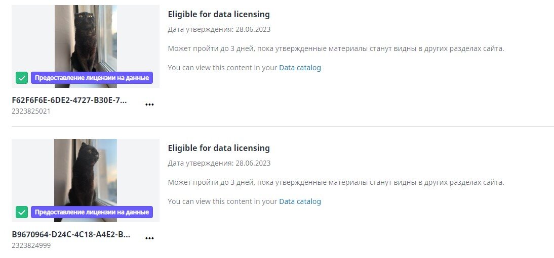 Эти фото НЕ находятся в моем портфолио на шаттерстоке. Но они приняты в базу как данные. Вот так это выглядит: Предоставление лицензии на данные. Я прочитала про это вот что: Тут можно прочитать подробнее. Не очень понятно, будет ли с этих фотографий доход и какой. Посмотрим. Но раньше у меня точно ничего не принимали в эти наборы данных. Я бы запомнила. А так из 11 фото только одну взяли в портфолио. ( Вот эту: 4 штуки приняли в эти "наборы данных" (одну с Пенни, две с Лео, одну с заливом), а шесть отбрили по причине "Очень похожий контент". Ну там да, одно и то же. Я на всякий случай закинула похожие очень, потому что по технике часто отбраковывают часть. А тут я то радовалась, что по технике все 11 прошли и висят на проверке! А рано радоваться, оказывается, если по технике проходят! Об этом я тут писала: У меня были начисления в мае за использование контента в обучении ИИ, как я поняла. И довольно существенная сумма по сравнению с моими продажами капнула на счет. ) Об этом я
