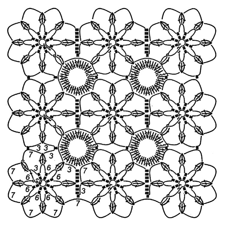 Есть огромное количество вариантов вязания узоров без отрыва пряжи. При этом узоры могут содержать круги, квадраты, цветы и много всего прочего. Нашла интересную схему вязания такого узора без отрыва пряжи, но больше всего меня привлек именно квадратный мотив, который связали таким узором. Итак, схема вязания квадратного мотива из узора: Вязание начинается с квадрата, в котором указано количество воздушных петель в арках. Движение вязания происходит следуя за непрерывной линией на схеме. Следуя таким образом по линиям можно связать узор любого размера. Вот связанный образец по этой схеме из журнала: А мне очень захотелось посмотреть как будет смотреться топ из таких квадратов. Самим узором мне топ не понравился - я не стала его делать. А вот топ именно из таких квадратов заинтересовал. Вот результат топа в программе: Результат любого мотива будет очень сильно зависеть от выбранной пряжи. Всегда помните: успех вязания на 90 % зависит от пряжи!!! Поэтому лучше купить более дорогую и к