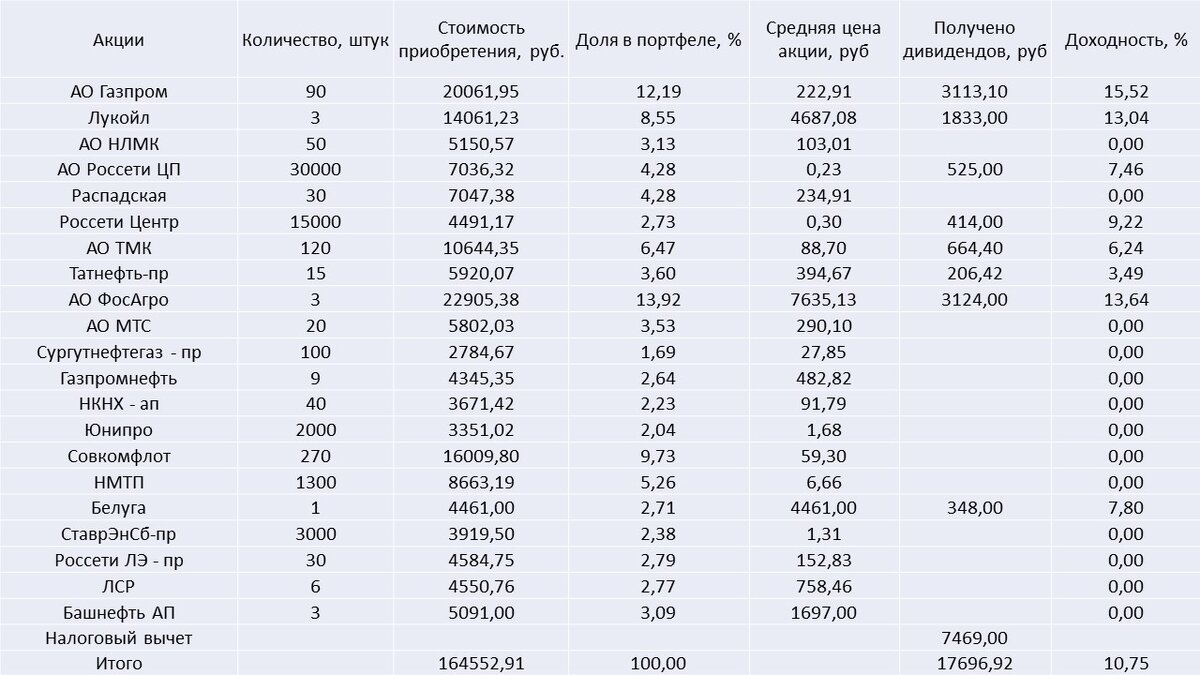 Все нижесказанное не является индивидуальной инвестиционной рекомендацией. На сегодняшний день портфель состоит из акций 21 компании. Полный перечень акций Вы можете посмотреть в приведенной выше таблице. За отчетный месяц в портфеле появились пара новых акций. Это акции компании ЛСР (6 шт.) и три акции Башнефть префы. Так же были увеличены доли акций таких компаний, как МТС (+ 10 акций), Россети ЛЭ-префы (+10 акций) и Татнефть-пр (+3 акции). Все покупки осуществлялись "под дивиденды". - За все время инвестиций на ИИС было внесено порядка 146856 рублей (+ 15029 рублей к предыдущему месяцу). - Получено дивидендов + налоговый вычет 16553 рубля (+1143 рубля к предыдущему месяцу - пришли дивиденды от Лукойла). - Дивидендная доходность портфеля составляет 10,75% (-0,43% к предыдущему месяцу). - Общий вес портфеля (внесенные средства + дивиденды/налоговый вычет + изменение курса акций) почти 198 тысяч рублей (+27600 рублей к предыдущему месяцу). Скриншот ИИС прилагаю. - Достаем калькул