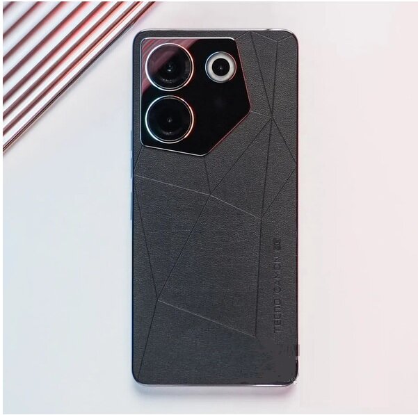 В целом, внешний вид Tecno Camon 20 Pro 5G соответствует дизайну других современных Android-смартфонов. Tecno утверждает, что дизайн, позиционируемый как деконструкция головоломки, был вдохновлен постмодернистской архитектурой. В устройстве используется фактурное кожаное покрытие задней панели с уникальным рисунком, а расположенный там же модуль камеры выполнен в форме пятиугольника. Подобное оформление хорошо скрывает отпечатки пальцев и пятна и производит впечатление роскошного внешнего вида, несмотря на пластиковую рамку смартфона.