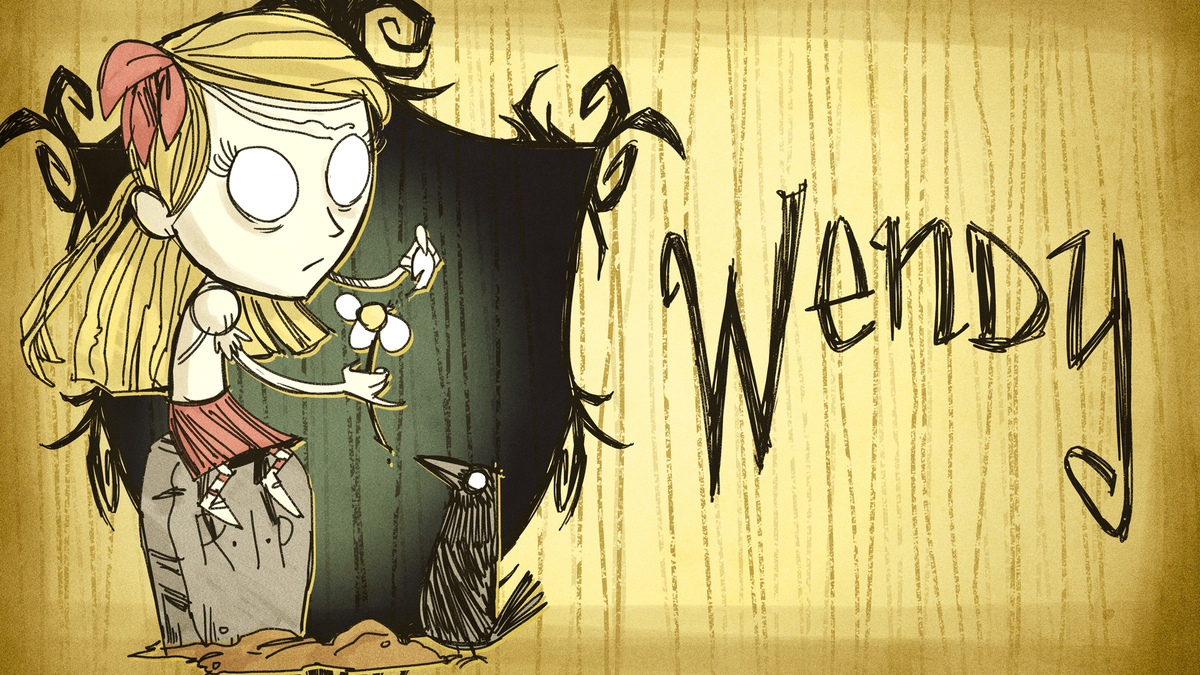 Венди (Wendy) — девочка с весьма макабристическими взглядами на жизнь. Всё происходящее вокруг неё связывает со смертью, даже саму себя. Чтобы открыть Венди, нужно 640 очков опыта (32 игровых дня, или же 4 часа 16 минут). Предыстория Рассказ о горе Венди начинается с преждевременной гибели её дорогой сестры Абигейл. Венди никак не могла принять мысль о том, что ей придётся продолжить жить без своей сестры. Она обратилась к оккультизму в надежде, что найдёт хоть какой-нибудь способ поговорить с теми, кто на другой стороне. В итоге, после долгих проб и ошибок, когда свечи с сеансов сгорели до основания, а все спиритические доски были выброшены в порыве гнева, девочка была почти готова сдаться и впасть в отчаяние... пока, наконец, не явился знак. Мелодия в стиле рэгтайм могла бы показаться весьма странным посланием из потустороннего мира, но Венди была готова хвататься за всё, лишь бы приблизиться к сестре. И конечно же, скоро голос расскажет ей, что нужно делать... Плюсы: Минусы: В DST