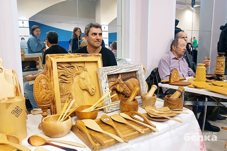 Свои деревянные картины и посуду привёз в Городской центр культуры Сергей Грибанов. Автор работает с разными породами дерева больше 20 лет, за это время у него появилось много постоянных клиентов, были и уникальные заказы. Например, как-то довелось оформить в Минске офис по продаже мебели. Он, пожалуй, один из самых активных участников городских ремесленных ярмарок.
