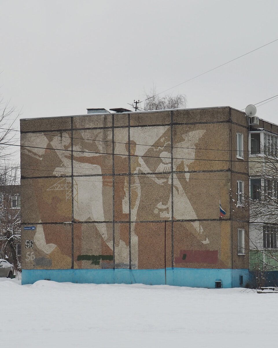 Начнем с микрорайона Фетровой фабрики, именно здесь, напротив производства можно увидеть первый артефакт - панно на жилом здании.