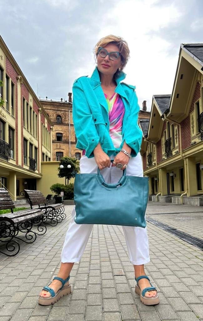 Футболка многоцветная, белые брючки и куртка из плотной хлопковой ткани бирюзового цвета.
