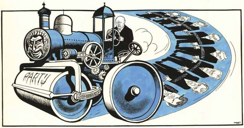 Карикатура голландского художника отражает, как увидели победу Хрущёва на Западе: на асфальтовом катке Первый секретарь ЦК КПСС раскатывает в блин своих оппонентов: Молотова, Булганина, Шепилова, Кагановича, Ворошилова, Первухина, Сабурова и Маленкова