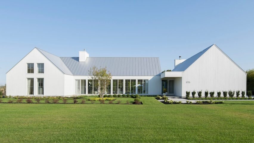 Вертикальная облицовка из белого дерева и светлая металлическая крыша придают дому фермерский вид, но с современной утонченностью.