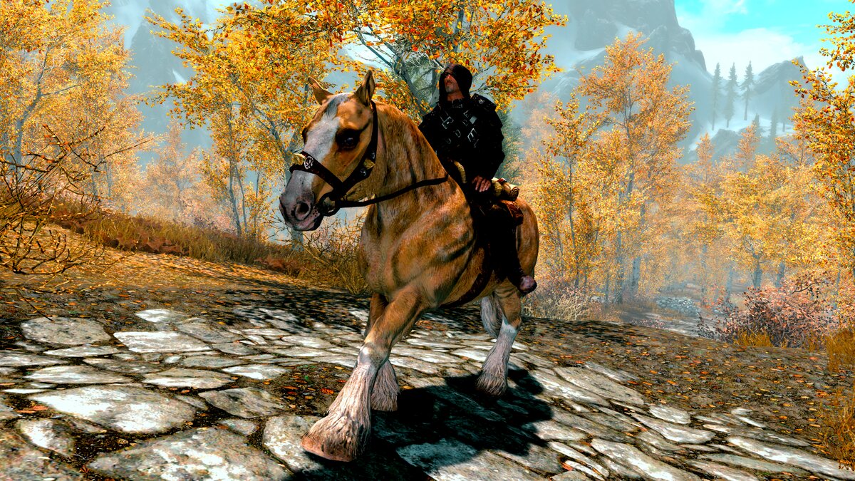 Но, не смотря на «благородство кровей», внешне коняга выглядит точь-в-точь так же, как и обычная верховая лошадь из конюшен Скайрима.