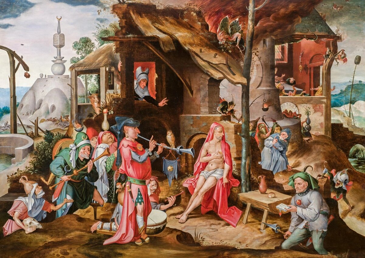 В каталогах эту картину называют,, Осмеяние Иова " . Возможно, автор мог так её назвать, вначале главы Иов называет себя осмеянным, но логичнее по сюжету было бы её назвать ,,Иов между отребьем и исчадием" . Словесный образ тот же - 30 глава книги . Отребье для которого стал он песняю. Цитата : ,, Бедностью и голодом истощенные, они убегают в степь безводную, мрачную и опустевшую; щиплют зелень подле кустов, и ягоды можжевельника - хлеб их. Из общества изгоняют их, кричат на них, как на воров, чтобы жили они в рытвинах потоков, в ущельях земли и утесов. Ревут между кустами, жмутся под терном. Люди отверженные, люди без имени, отребье земли! Их-то сделался я ныне песнью и пищею разговора их." Также художник изобразил можжевельник, еду этого отребья. Справа от него в проёме мы видим исчадье. Художник добавил пламя, чтобы мы догадались, что исчадья ада. Цитата : С правого боку встает это исчадие, сбивает меня с ног, направляет гибельные свои пути ко мне. А мою стезю испорти