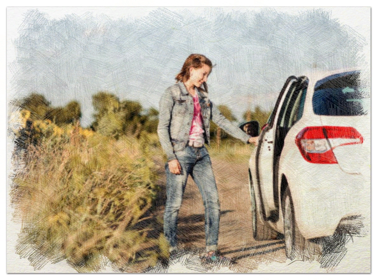 Он проехал около половины пути, когда увидел на дороге женщину с ребёнком на руках. Она настойчиво махала и просила остановиться. Чуть в стороне стояла машина, в которой возился мужчина. Похоже, что он пытается её починить.