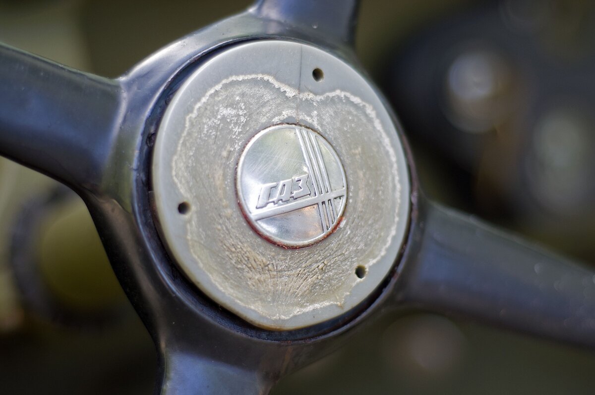 Ну уж коли вспомнили про бензобак, поговорим и про него (точнее, про оба). Основной (43 л), который стоит перед водителем, попал сюда прямиком от ГАЗ-ММ. Отличие у него только одно: мог быть выступ под рулевую колонку. А мог и не быть. Сказать точно, когда он появился, трудно: каталожные номера у баков одинаковые. Однако есть предположение, что случилось это приблизительно в то же время, когда карболитовый руль заменили на вот этот вот деревянный с четырьмя спицами. Замена была вынужденной: цех, где изготавливали карболитовые рули, был уничтожен во время бомбёжки, поэтому пришлось практически за сутки придумать новый руль. Сделали вот такой – с литыми чугунными спицами и деревянным ободом. Позже его заменили на трёхспицевый пластмассовый руль, который оставался в строю чуть ли не 60 лет. Диаметр деревянного руля был больше, чем карболитового, поэтому рулевую колонку пришлось приподнять. А она и так здесь стоит странно: с уклоном в 10 градусов в левую сторону. Причина очевидна: из широкого салона провести прямую колонку в узкий моторный отсек другим способом было невозможно. Поэтому руль имеет необычный разворот в левую сторону относительно водителя.