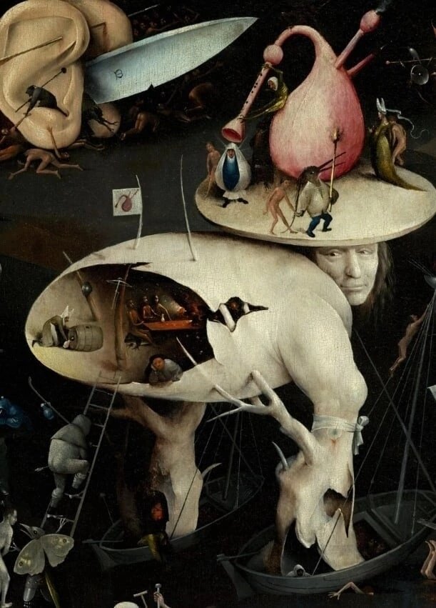 Продолжение статьи. Так же как у Брейгеля,образ в центре сюжетной композиции. У нас три главных элемента: корабль, сердце, и дом. Корабль есть у Босха, дом тоже-таверна в которой сидят персонажи. А где сердце? Сердцем может быть только волынка, вот так он его написал-не как Брейгель буквально, а стилизовано. А почему тогда сердце оказалась на голове? Вобще просто ,, потому что из сердца выходят злые помыслы " Евангелие от Матфея. Так вот кто это ,,ходит и советует нечестиво " Псалом 1 . Помыслы. Полностью сочитается образ с толкованием Василия Великого. Что за ножи окружают Босховсое дерево не праведности с двух сторон? Это важный элемент композиции, судя по его расположению. А какой у Брейгеля важный элемент в аду? Какой персонаж самый большой? Безумная Грета! Что она символизирует? Гнев, ярость! Теперь посмотрим на гравюру Брейгеля- старшего с названием ,, Гнев " . Та же фигура Греты и те же огромные ножи. Значит у Босха это тоже гнев. А теперь подумаем , почему такое важно