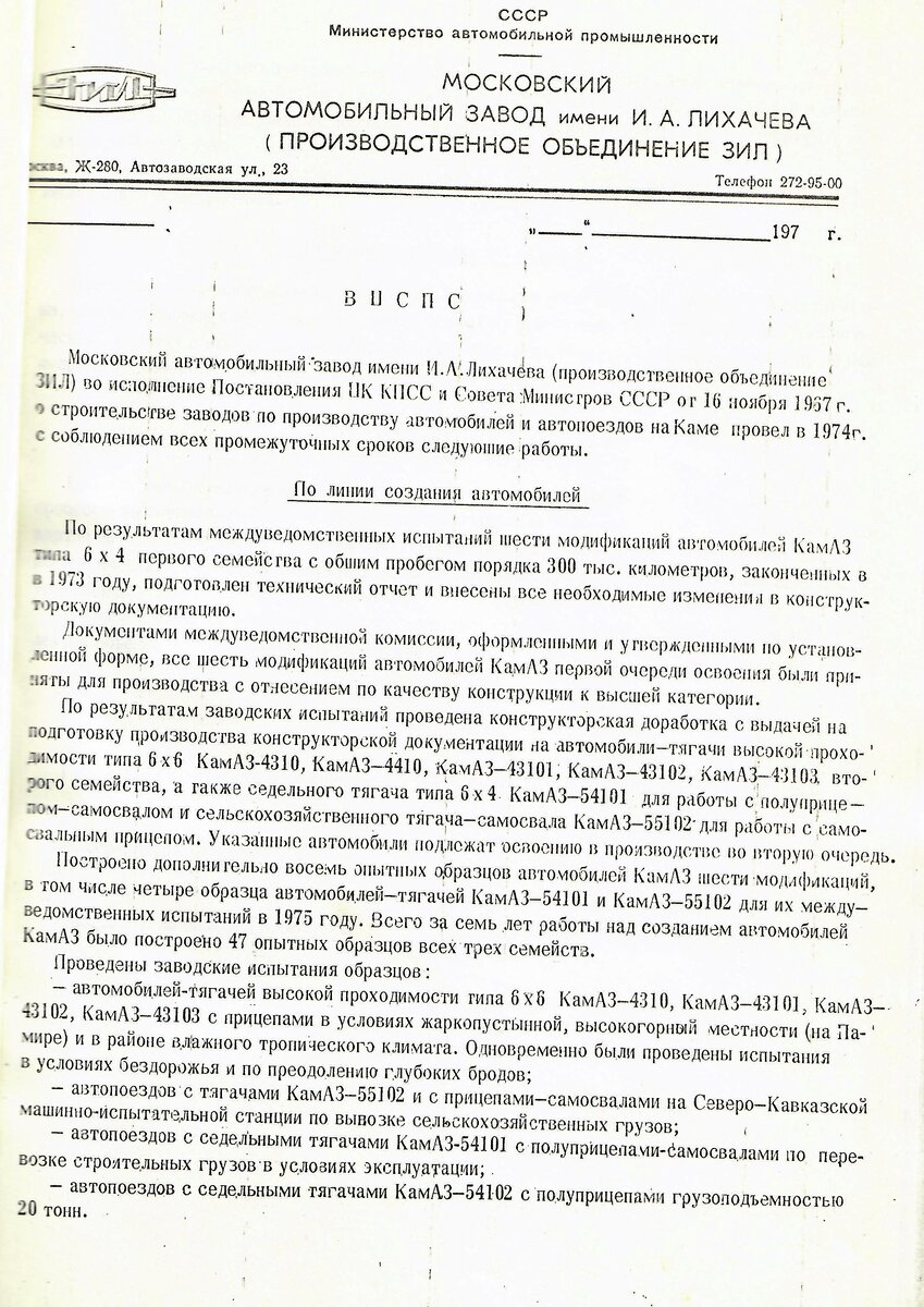 Как известно, завод имени Лихачёва (ЗИЛ) в период с 1968 по 1974 год изготовил и провёл испытания четырёх серий различных автомобилей КАМАЗ. Внизу справка о создании автомобилей, подписанная Бородиным Павлом Дмитриевичем – генеральным директором ЗИЛа. О том, какой пробег «накатали» автомобили КАМАЗ всех трёх серий по состоянию на 1 сентября 1973 года рассказывает вот эта справка. Внизу публикация из газеты «Известия» за 1972 год. Внизу заметка из газеты «Смена» (г. Калинин, ныне Тверь) от 1 февраля 1973 года. Внизу новость, опубликованная в газете «Правда» от 9 февраля 1973 года. Внизу маршрут испытаний автомобилей КАМАЗ-4310 в 1974 году. Внизу автомобиль КАМАЗ-4310.