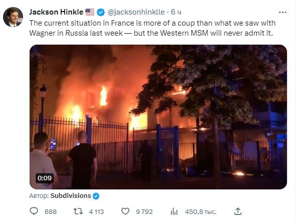 «Ситуация во Франции похожа на переворот куда больше, чем история с группой "Вагнер" в России на прошлой неделе. Но западные СМИ никогда этого не признают», — заявил американский журналист Джексон Хинкл.