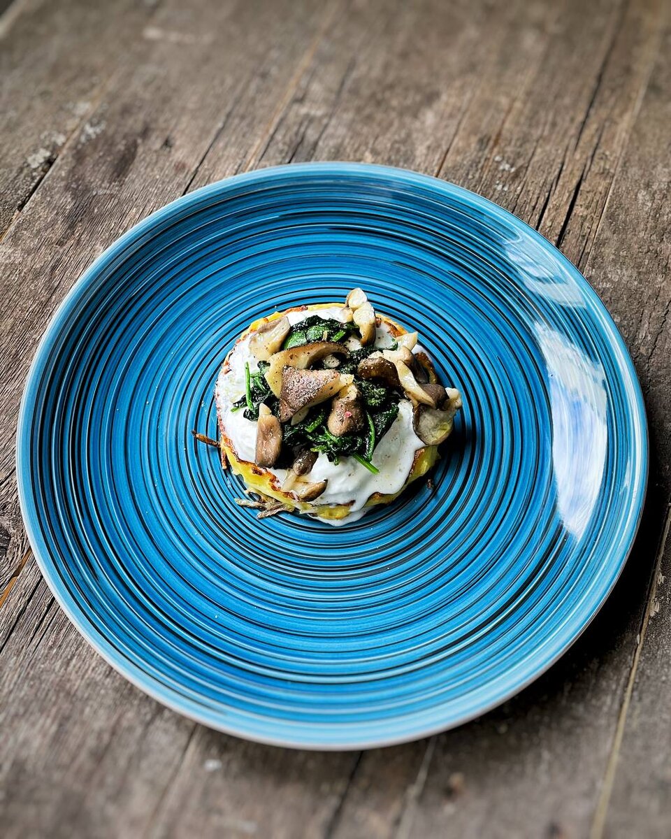 Выложить драник в центр тарелки, положить сверху пару столовых ложек страчателлы, шпинат и сверху грибы.