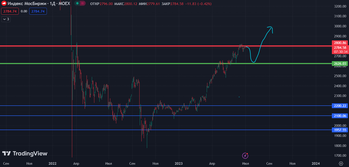Российский рынок акций продолжит свой рост после локальной коррекции. Рост индекса будет в основном за счет Газпрома, Лукойла, Норникеля, Роснефти и других компаний, которые занимают существенную долю в индексе МосБиржи. Инфляция продолжает расти из-за девальвации рубля, поэтому ЦБ РФ в любом случае будет повышать ключевую ставку. Но за счет слабого рубля компании-экспортеры получат хорошую прибыль по итогам 2-3 квартала. По мере повышения ключевой ставки, к 4 кварталу доллар будет снижаться в район 75 руб. Поэтому в 4 квартале прибыль экспортеров будет снижаться. Индекс МосБиржи Индекс скоро опять коснется 2800 пунктов, после чего будет локально снижаться вплоть до 2600 пунктов (-7%) – но отсюда уже начнется рост к уровню 3000 пунктов (+7%). 📌Газпром Бумагу максимально занегативили. Мое мнение, что Газпром неожиданно для всех будет закрывать свой гэп на 200 руб (+17%). Газпром все еще поставляет газ в европу и поставки все еще немаленькие. И за счет высокого доллара, Газпром будет п