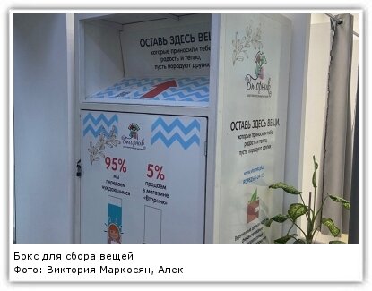 - благотворительный магазин — это 5-7% от общего количества собранных вещей. Перед продажей одежда и обувь отправляются в озонирующий шкаф, где проходят полную обработку (вещи не имеют запаха, как в обычных секонд-хендах). Продажа одежды позволяет нам содержать склад, оплачивать труд сотрудников и создавать новые интересные проекты.
