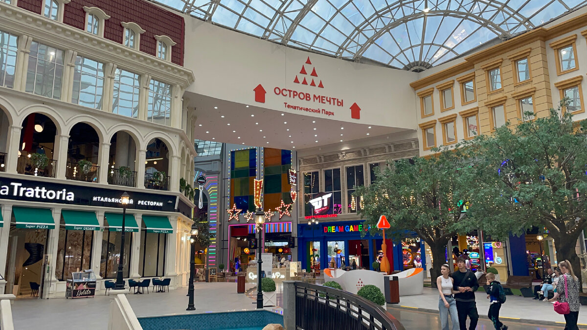 Единственное, что отличает торговый центр в «Острове мечты», — деление на географические зоны, здесь есть «Барселона», «Рим», «Москва», «Лондон» и «Беверли-Хиллз» с копиями 120 фасадов известных зданий: от Дома Бальо до Колизея. Выглядит это как пластиковые разноцветные коробки.