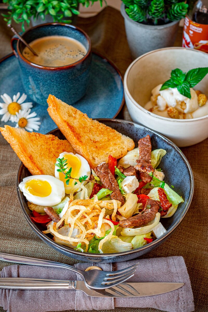 Согласитесь, летом хочется чего-то легкого, яркого, вкусного, необычного! Что же я могу вам предложить?🙃 Мне кажется, что вы у меня очень искушенные в этом плане подписчики))) Что мы с вами только не готовили👌👨🍳 Что ж, удивлю и в этот раз - сделаем Салат-боул с говядиной, вялеными томатами и брынзой😍 Салат-боул — новый гастрономический тренд! Это салаты, которые заменяют собой целый обед или ужин: они питательные, сытные и вкусные. Часто ингредиенты не смешивают, а красиво выкладывают — и салат становится похож на мозаику. Люблю я на завтрак такие «мешанины», когда всё в одной миске)) ИНГРЕДИЕНТЫ: ПРИГОТОВЛЕНИЕ ⚡ ШАГ 1. Возьмем кусочек говядины. Я использую дешевые стейки для этих целей. Например, от Мираторга. ⚡ ШАГ 2. Поставим отваривать яйцо. Я варю после закипания 3-4 минуты, чтобы желток был жидковатым. ⚡ ШАГ 3. Нарежем мясо тонкими брусочками, перец соломкой. На раскаленной сковороде обжарим мясо и перец. Огонь должен быть большим, чтобы всё обжаривалось, а не тушилось
