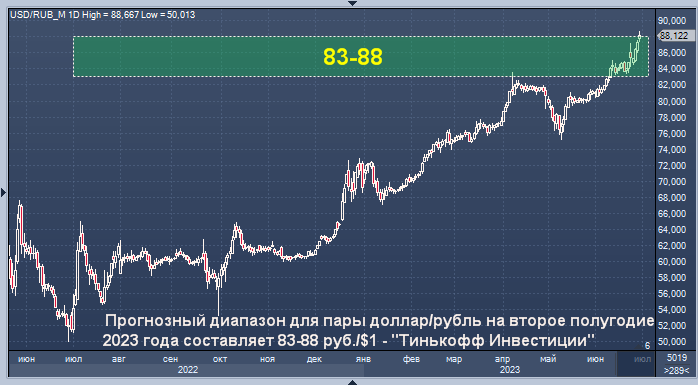 Прогнозный диапазон для пары доллар/рубль на второе полугодие 2023 года составляет 83-88 руб./$1 - "Тинькофф Инвестиции" Курс доллар/рубля на Мосбирже интервалами в 1 минуту Курс доллар/рубля на Forex интервалами в 4 часа Фундаментальные причины для слабости рубля имеются. Поэтому возможно дальнейшее снижение курса нацвалюты против ведущих мировых валют в ближайшее время, считают аналитики "Тинькофф Инвестиций". Они связали падение рубля в последние дни с окончанием налогового периода, а снижение с начала года с прогнозом большинства экспертов касательно сокращения объемов российского экспорта из-за санкций. Этот прогноз подтверждается. Также импорт продолжает медленно восстанавливаться. Падающий профицит счета текущих операций будет и дальше вызывать умеренное ослабление рубля. Еще одной причиной слабости отечественной валюты стала растущая неопределенность. "События минувших выходных, вероятно, усилят отток капитала из страны. Основным драйвером будет выступать в первую очередь насел