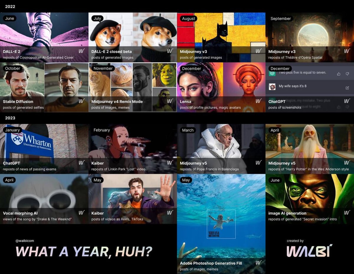 Этот год можно с уверенностью назвать годом ИИ-хайпа. Сама удивляюсь, когда понимаю, что релизу Stable Diffusion меньше года и пошлым летом я еще работала в Disco. Подписчик Кирилл Шиханов сделал классную инфографику с таймлайном прошедших 12 месяцев и инфоповодами в сфере Искусственного Интеллекта. Профессионалам поможет освежить память, а новичкам оценить прогресс и узнать новое. Приятно, что иллюстрация фотошоп-релиза иллюстрирована работой Александра Доброкотова. К инфографике прилагается список ссылок и источников в медиа. Hype period — Viral tech, app — Where goes viral 2022: June — DALL-E 2 — reposts of Cosmopolitan AI-Generated Cover (Cosmopolitan, Know Your Meme, Adweek) July — DALL-E 2 closed beta — posts of generated images (TechCrunch, Twitter) August — Midjourney v3 — posts of generated images (TechCrunch) September — Midjourney v3 — reposts of Théâtre d'Opéra Spatial, winner of Colorado State Fair (Wikipedia, KnowYourMeme) October — Stable Diffusion — posts of generated