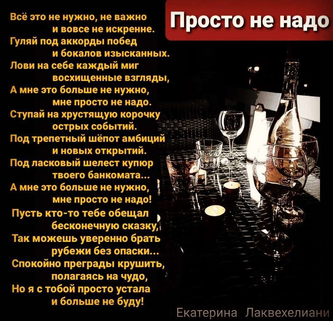 Некоторые вещи в жизни не нужны. Просто не нужны! Жаль, время требуется, чтоб это понять! Моя страничка на Литрес. Читайте мои книги Моя группа ВКонтакте. Заходите, читайте Больше моих стихов по ссылке https://stihi.ru/avtor/stkatrina © Copyright: Екатерина Лаквехелиани, 2023 Свидетельство о публикации №123021505908