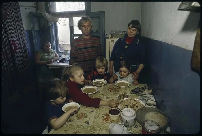 PS: На самом деле, в данном фото я вижу много хорошего: большая полная семья (мама + папа), где много детей (4, как минимум), уважение к старшим (бабушка также на фото) сидят за общим столом. Да, скудным, но тарелка супа и что-то из выпечки есть у каждого. И в этом фото я вижу куда больше света и надежды, чем в некоторых современных фото.