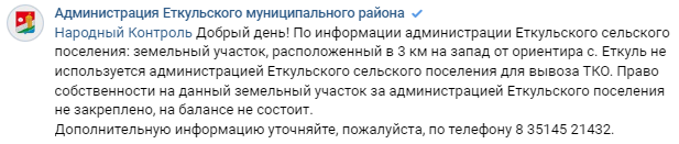 Публикуем ранее поступивший ответ по обращению жителей Еткульского района Челябинской области – https://nkregion.ru/news/byvshaja-svalka-v-lesu-zavalena-svezhim-musorom-vse-jeto-gorit/. Добрый день! По информации администрации Еткульского сельского поселения: земельный участок, расположенный в 3 км на запад от ориентира с. Еткуль не используется администрацией Еткульского сельского поселения для вывоза ТКО. Право собственности на данный земельный участок за администрацией Еткульского поселения не закреплено, на балансе не состоит. Дополнительную информацию уточняйте, пожалуйста, по телефону 8 35145 21432. Благодарим Администрацию Еткульского муниципального района за комментарий. Если Вам стало известно о совершаемых правонарушениях — сообщайте Нам о данных фактах через наше мобильное приложение. Желательно указывать максимальное количество данных при обращении, чтобы с большей вероятностью решить проблему.