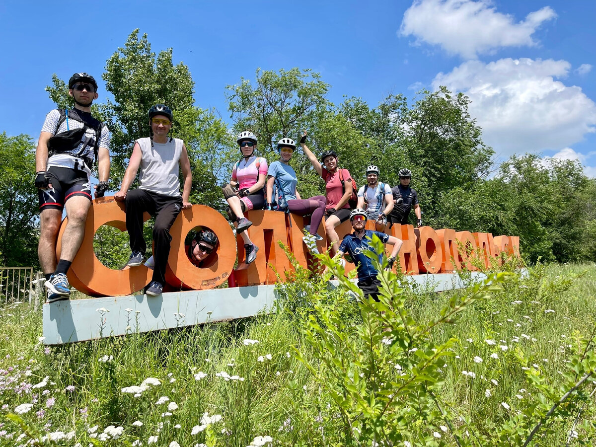 Но вот далее, на протяжении всего маршрута мы двигаемся под палящим солнцем. Такое перенести куда тяжелей! И, наконец, доехав к Солнечнодольску, я из последних сил фотографировалась на фоне муралов. Потому что солнце, лично меня, реально вымотало. Но оказавшись на пляже, окунувшись с головой в Новотроицкое водохранилище, усталость меня покинула! Только как же быстро прошли эти полтора часа на пляже, в тени деревьев и освежающей прохладе воды… И снова это солнце… Когда мы ехали обратно, по моему лицу стекали капли пота, которые также капали и на раму велосипеда.