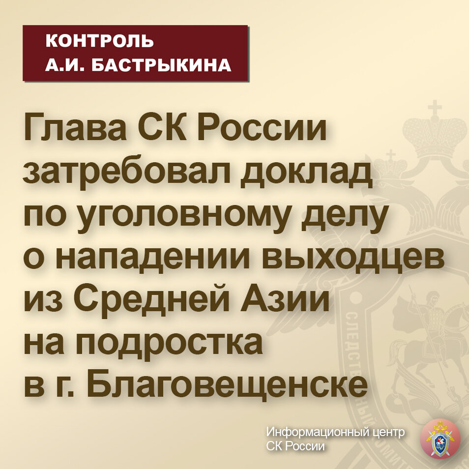 Глава СК России затребовал доклад по уголовному делу о нападении выходцев из Средней Азии на подростка в г. Благовещенске