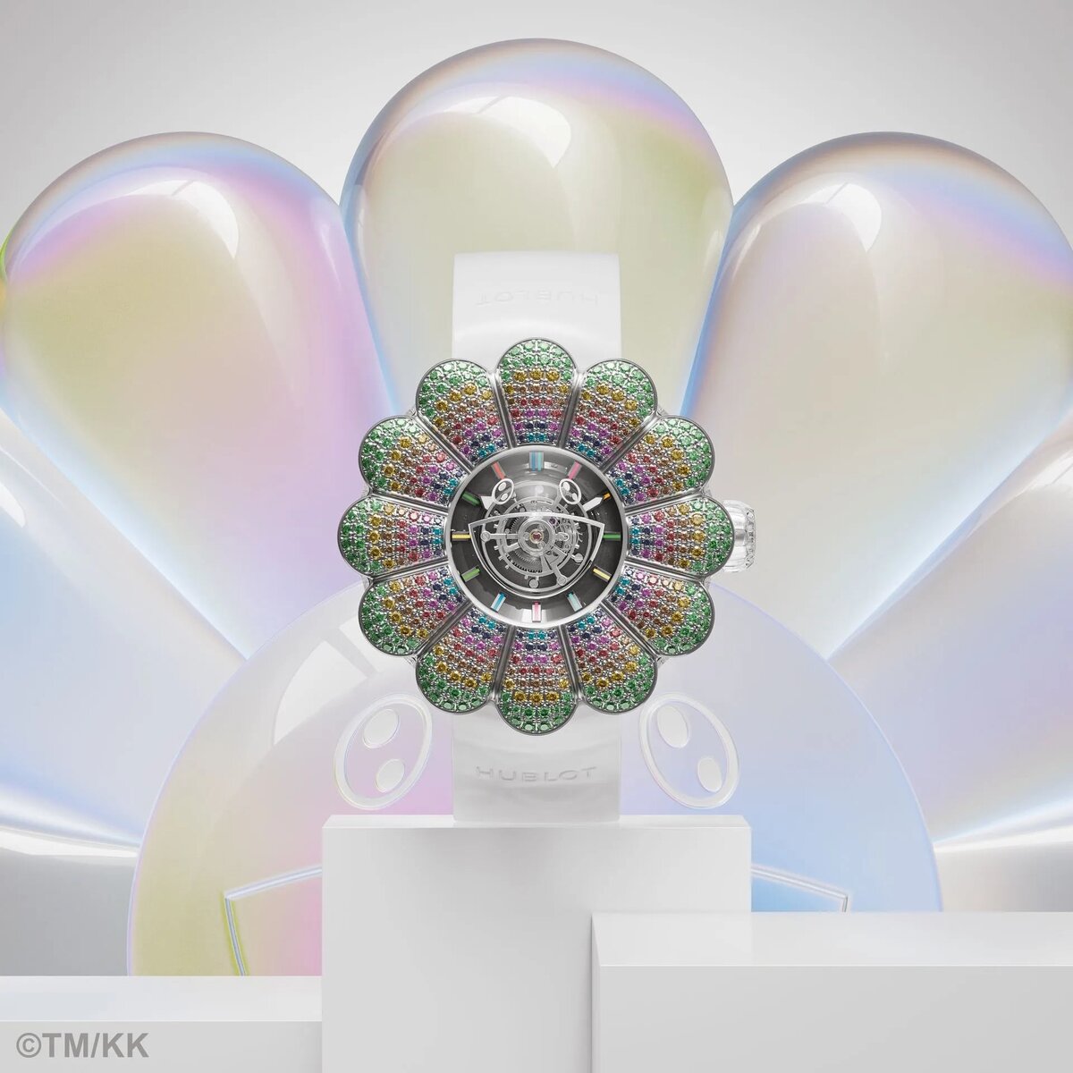 Для придания большего сходства с мультяшным цветком Мураками выпуклое сапфировое стекло над турбийоном получило подобие глаз и рта. Время на часах отображается парой миниатюрных стрелок, которые как будто движутся под турбийоном. Сам диск циферблата с цветными часовыми метками изготовлен из прозрачной композитной смолы. Тему с прозрачностью поддерживает каучуковый ремешок, оснащенный стильной застежкой из титана и сапфира.