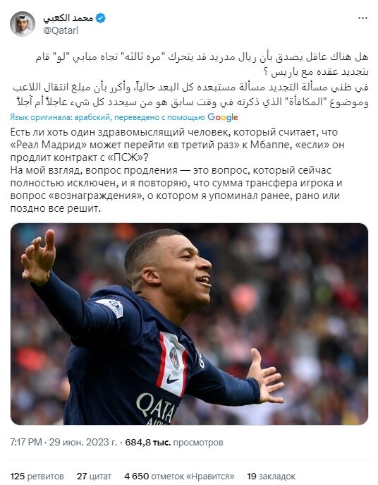 Или даже на это можно закрыть глаза? «Реал Мадрид» навсегда откажется от Килиана Мбаппе, если после всего произошедшего он вновь изменит свое мнение и продлит контракт с «ПСЖ», утверждает катарский журналист Мохаммед Аль-Кааби, близкий к руководству столичного клуба. Как сообщала Marca, сегодня представители Мбаппе должны снова встретиться с «ПСЖ», где парижане сделают все возможное, чтобы убедить игрока продлить контракт на 2-3 года с устным обещанием продать его в 2024. История развивается по очень похожему сценарию, что и в 2022 году. Однако на этот раз нападающий отправил письмо в свой клуб, в котором сообщил, что не будет продлевать контракт, когда он истечет в следующем году. При этом игрок хочет остаться в Париже еще на год, так как по контракту ему полагался бонус в 90 миллионов. Сообщалось, что «Реал» готов пойти ва-банк, если Килиан все же откажется от продления, и вследствие этого «ПСЖ» выставит его на продажу. Однако если он снова решит остаться, кто знает, закончится ли эт