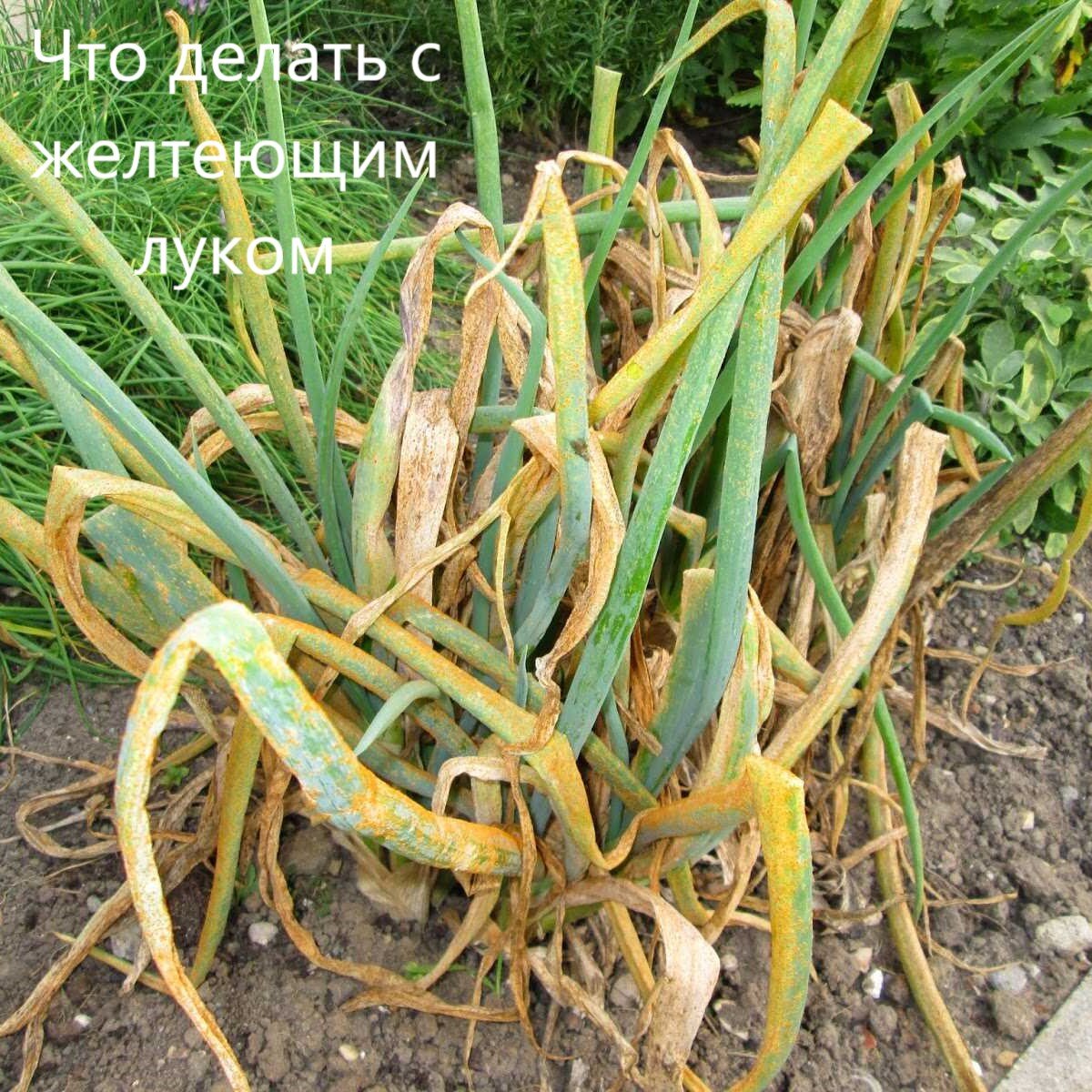 Если нет ни болезней ни вредителей, то луковицам не хватает питания, точнее азота. Можно подкормить мочевиной, аммиачной селитрой, диаммофоской или любы другим удобрением, где в составе есть N (азот). Биогумус, зола и "зеленые" удобрения не подойдут, в них азота совсем мало.