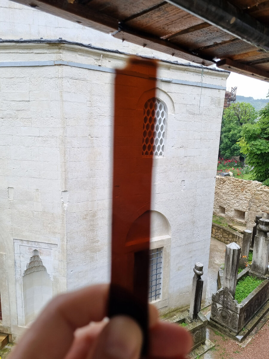 Приветствую вас, мои дорогие читатели! Прошла третья неделя, как я работаю на работах в мечети. Но хочу я рассказать о цветных стеклышках, которыми искусно выложены витражи мечети. Пропуская и преломляя солнечный свет, стеклянные цветные окна создают оригинальные световые и цветовые эффекты. Это формирует в помещении особую атмосферу таинственности. А оформлял дворец, в правление Крыма Герая (1758 - 1769 г.г. правления) - главный художник и каллиграф Ханского дворца Умер (Омер). Витражное цветное стекло - это стекло, которое окрашено добавлением солей металлов в процессе изготовления. Затем такие стёклышки соединяются полосками свинца, меди, латуни. В мечети Ханского для скрепления цветных стеклышек использовали смесь гипса и глины. Такая смесь называлась "ганч" (на Кавказе "гажа"). Для изготовления зелёного или голубовато-зеленого стекла, в расплавленное стекло добавляли оксид меди. При добавлении окиси кобальта, получали темно-синее стекло. А при добавлении золота получали вин