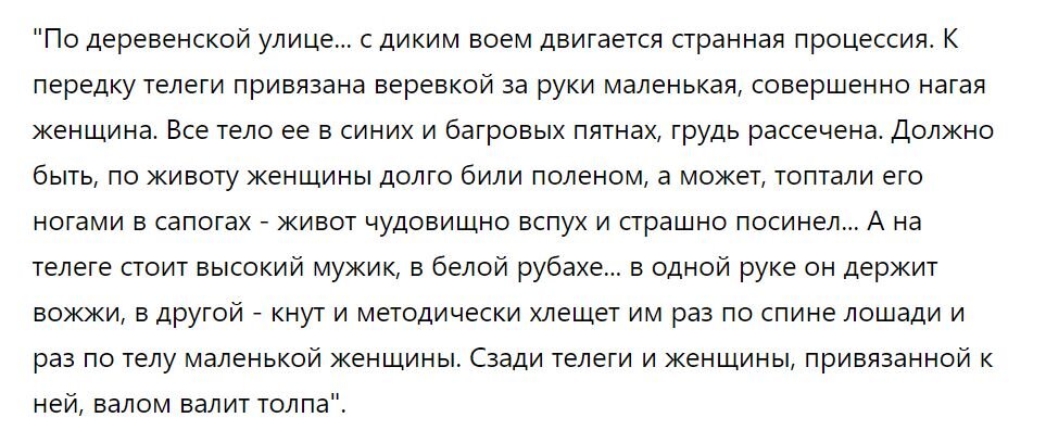 Эту инфернальную картину увидел своими глазами 23-летний бродяга-босяк, начинающий писатель Алексей Пешков, которого вскоре весь мир узнает как Максима Горького. Описанное произошло в июле 1891 года в деревне Кандыбовке Херсонской губернии, и называлось это жесткое действо - вывод. Уличенную в измене жену муж выводил на позорящее наказание при всем честном народе.