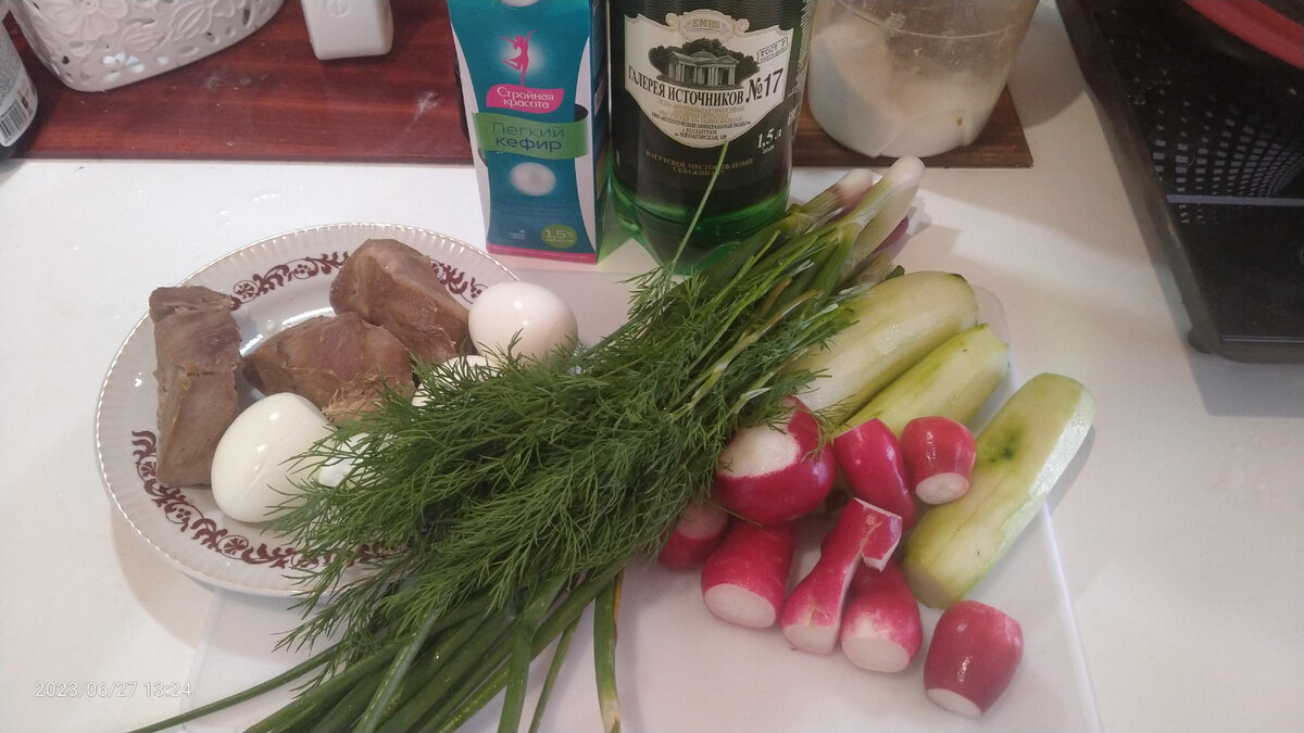 Доброго дня всем читающим мой канал! Теплые летние дни, огурчики в теплице, зелень на грядке... Давайте сделаем совершенно диетическую окрошку по-грузински . Продукты: Отварное нежирное мясо( филе куриное , индейка или говядина) Огурцы Яйца отваренные вкрутую Редис Зелёный лук Укроп Для заливки: Мацони( можно и кефир) Минеральная вода с газом или без газа по желанию . ОВДУХ вообще разводят простой водой. Мне нравятся Ессентуки . Мясо отварить до готовности и остудить в бульоне. Так оно останется сочным . Нарезаем на кубики. Яйца, огурцы и зелень так же нарезаем. Чистить огурец или нет- по вашему желанию . У меня шкурка грубая. Так же и редис уже загрубел и я натёрла его в крупную тёрку. Все перемешиваем. И ставим в холодильник охладиться. Ни в коем случае не солим смесь в общем блюде. Выкладываем в глубокую тарелку Добавляем кефир или мацони. Кстати, закваску мацони я беру на WB и, пожалуй, сделаю мастер класс по приготовлению. Если положить много мацони или кефира , то окрошка бу