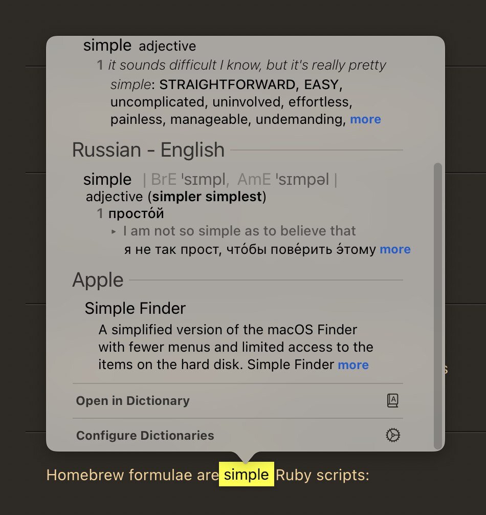 В макбуках, начиная с прошки 15 2015 появился Force Touch – возможность двухуровневого нажатия в тачпаде. По умолчанию это действие используется для поиска слов. Т.е. наводите курсор на любое слово, делаете двухуровневое нажатие, и открывается маленькое окошко с определением и переводом слова (см. скриншот). Вы можете настроить это отображение, нажав в низу окна на иконку шестеренки с подписью Configure Dictionaries (Настроить словари), и затем выбрав нужные толковые и словари переводом. Если у вас нет возможности использовать Force Touch, то аналогичное действие можно выполнить хоткеем Ctrl+Cmd+D. _ Подписывайтесь на телеграм-канал https://t.me/macos_vopros – советы по macOS, макбукам, решения проблем.
