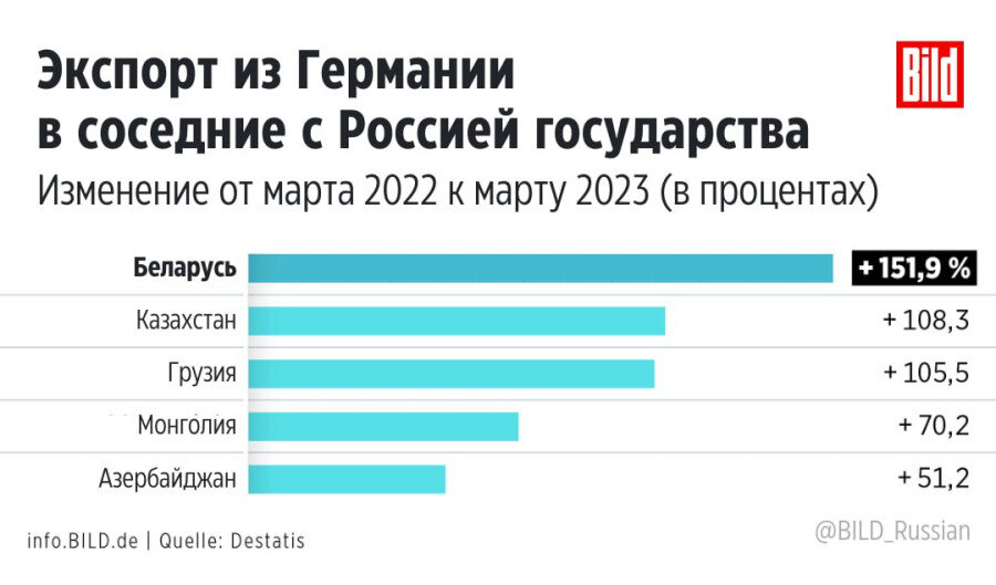 Как всем известно, после начала СВО на Украине Германия почти полностью свернула торговые отношения с Россией. И резко увеличила свой экспорт в страны-соседи России. Куда в действительности этот экспорт направляется — думаю, пояснять не надо. И так все все понятно. Помните, что говорили про капиталиста и 300% прибыли?