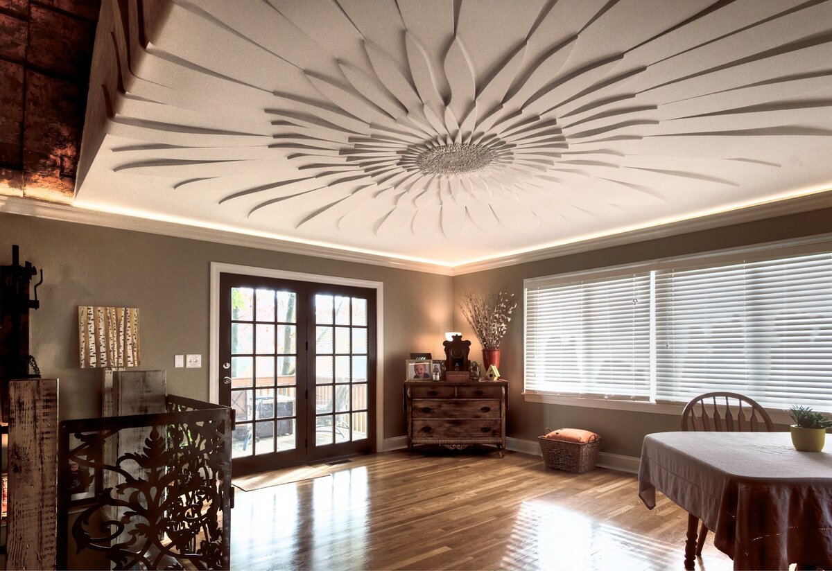 Потолок является важной частью интерьера, которая может быть использована для создания уникального и эстетически привлекательного облика помещения. Оформление потолка может значительно влиять на общую атмосферу и визуальные впечатления от интерьера. В этой статье мы рассмотрим несколько интересных идей для оформления потолка в доме, которые помогут придать вашему пространству особый шарм и стиль. Потолочные молдинги и розетки: Установка потолочных молдингов и розеток является классическим и элегантным способом оформления потолка. Молдинги могут быть использованы для создания рамок вокруг потолочных светильников или в качестве декоративных элементов вдоль периметра потолка. Розетки же представляют собой круглые или овальные панели, установленные в центре потолка, которые добавляют изысканности и роскоши в интерьер. Текстурные покрытия: Одним из способов придания уникального внешнего вида потолку является использование текстурных покрытий. Например, штукатурка с различными фактурными п