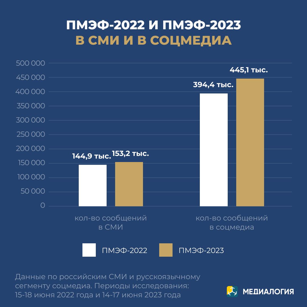 14-17 июня прошло одно из самых ярких и важных деловых событий - Петербургский международный экономический форум, который за 25 лет стал ведущей площадкой для обсуждения ключевых вопросов глобальной экономики и обмена лучшими практиками. Используя систему Медиалогия, провели сравнительный анализ упоминаемости ПМЭФ в 2022 и 2023 годах, проанализировали самые обсуждаемые компании в СМИ и соцмедиа во время форума, а также посчитали цитируемость ключевых СМИ. Анализ данных показывает, что ПМЭФ-2023 упоминался почти в три раза чаще, чем ПМЭФ-2022, как в СМИ так и в соцмедиа. Самыми упоминаемыми компаниями в СМИ в контексте ПМЭФ-2023 стали Сбер (10,44 тыс. сообщений), ВТБ (4,76 тыс.) и Росатом (3,22 тыс.). Пользователи соцсетей чаще всего обсуждали Сбер (18,90 тыс. сообщений), Газпром (7,88 тыс.) и АВТОВАЗ (6,18 тыс.). ТОП-5 СМИ по цитируемости в контексте ПМЭФ-2023 возглавили ТАСС (634,55 ), РИА Новости - (577,06) и РБК (119,35). Методика Данные по российским СМИ и русскоязычному сегменту с