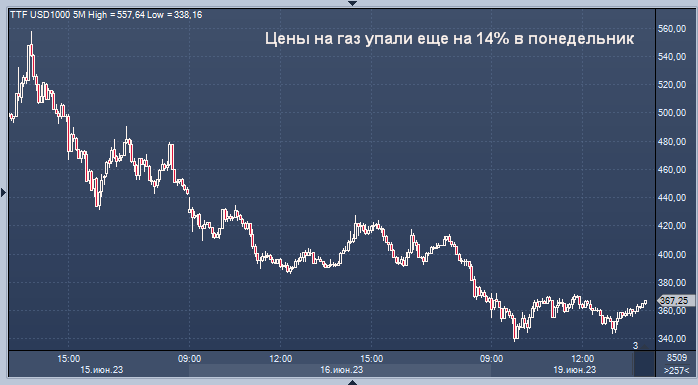 Голубое топливо в Европе продолжают падать в цене по мере осознания отсутствия проблемы с предложением График цены ближайшего фьючерса на спотовый индекс газа TTF на бирже ICE Futures (в долларах США за тысячу кубометров) интервалами в 5 минут Европейские цены на газ упали второй день подряд, сведя на нет часть роста этого месяца после нескольких недель интенсивной рыночной волатильности, связанной с рисками поставок и жаркой погодой. Эталонные фьючерсы упал на 14% в понедельник утром после закрытия прошлой недели с самым большим падением с августа. Цены по-прежнему растут примерно на 15% в этом месяце после серии сбоев в поставках и предупреждений о жаркой погоде, которые поставили трейдеров в тупик из-за баланса спроса и предложения топлива. После нескольких недель бурных ценовых колебаний стоимость охлаждающего помещения газа позволяет предположить, что на рынок может вернуться некоторая стабильность. Запасы остаются более заполненными, чем обычно в течение этого времени года, но во