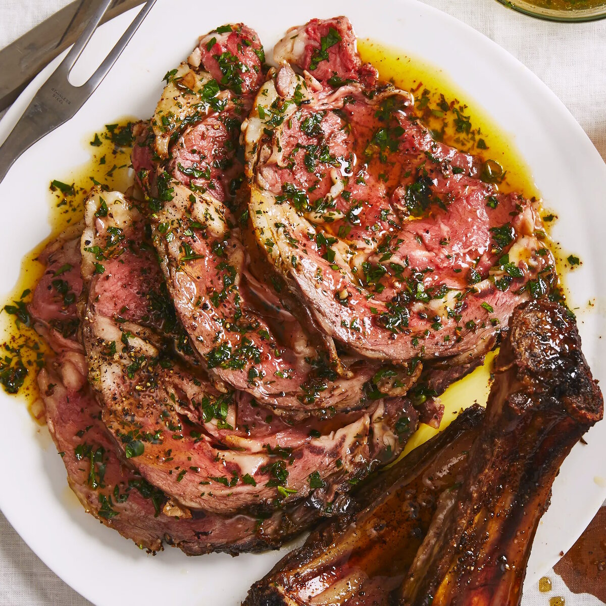 ■ По желанию снимите мясо с кости. Нарежьте мясо до желаемой толщины. Выложите на тарелку и посыпьте смесью петрушки и солью. По желанию при подаче украсьте дополнительными анчо