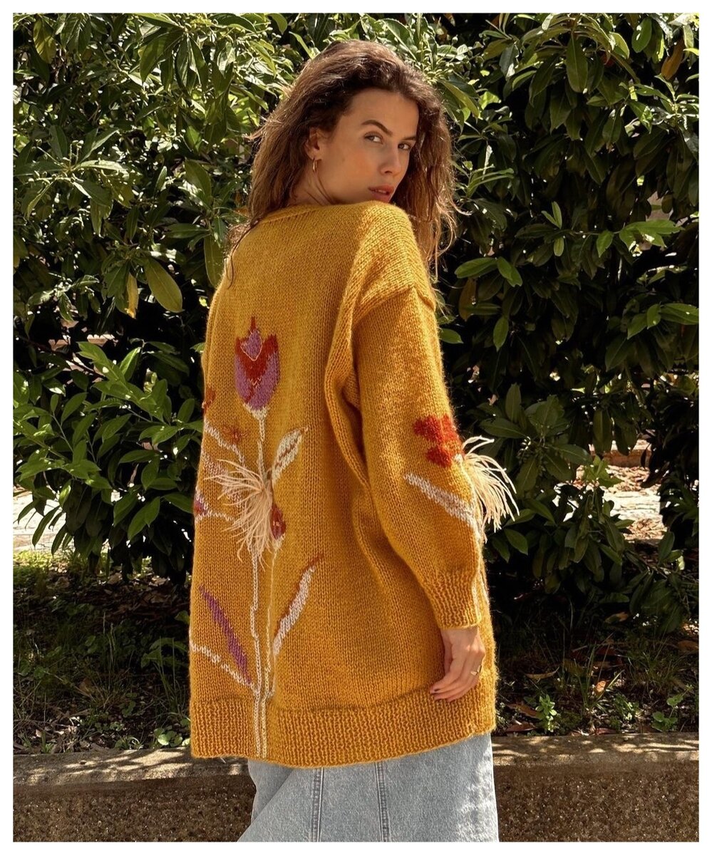 Яркая, женственная, стильная, не скучная. Так хочется охарактеризовать новую коллекцию сербских вязальщиц. О самом бренде "Maridruna" я вам уже рассказывала здесь А сегодня хочу познакомить вас с их новой коллекцией. Объемный кардиган оверсайз, вышитый вручную роскошными цветами. Нравятся и эти блестящие занятные круглые пуговицы: Больше всего кардиган приглянулся мне в белом цвете. Цветочная тематика продолжена дизайнером в других моделях: джемперах, юбках, топах. Летний вариант кардигана связан крючком ажурным цветочным узором. Посмотрите как автор интересно сочетает пушистики, напоминающие бутоны хлопка и блестящую нить, изображающую веточки. Удлинённый вариант кардигана смотрится не менее эффективно. Я не умею вязать крючком. Тем более не разбираюсь в схемах и все же попыталась найти нечто похожее. Так что не судите слишком строго) Вот мои варианты. Если вы знаете верную схему, поделитесь и с нами в комментариях 🙂🤝. Яркие туники бренда также выполнены крючком А на этом фото пре