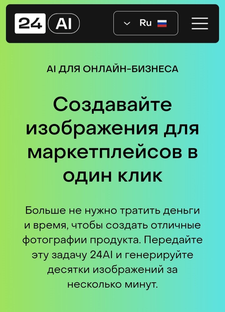 Речь идёт именно о нейросети для маркетплейсов app.24ai.tech. Эта нейросеть отлично справится с созданием изображения товаров, которая за 5 секунд сгенерирует идеальную фотографию продукта. Десятки вариаций визуала можно создать буквально за минуты, выбрать лучшие и самые подходящие для своих карточек товаров или для использования в маркетинге. Данная нейросеть адаптируется под нужный размер: вертикальный, горизонтальный, пост в фейсбук или сторис, карточка для Озона/Вайлдберис или Авито. Всё это значительно экономит время на подготовку графики. Как именно это сделать? Загружаете фото товара, описываете контекст и нейросеть интегрирует фото в соответствующий описанию фон. Пошаговый план: 1️⃣ Загружаете исходную фотографию товара (с фоном или без фона). Нейросеть сама удалит фон, если это необходимо. 2️⃣ Выбираете положение предмета, поворот, размер, цвет и стиль. Пишите описание того, где он находится. Далее можно выбрать одну из 17 предложенных тем. 3️⃣ Нажимаете "Генерировать". Нейр
