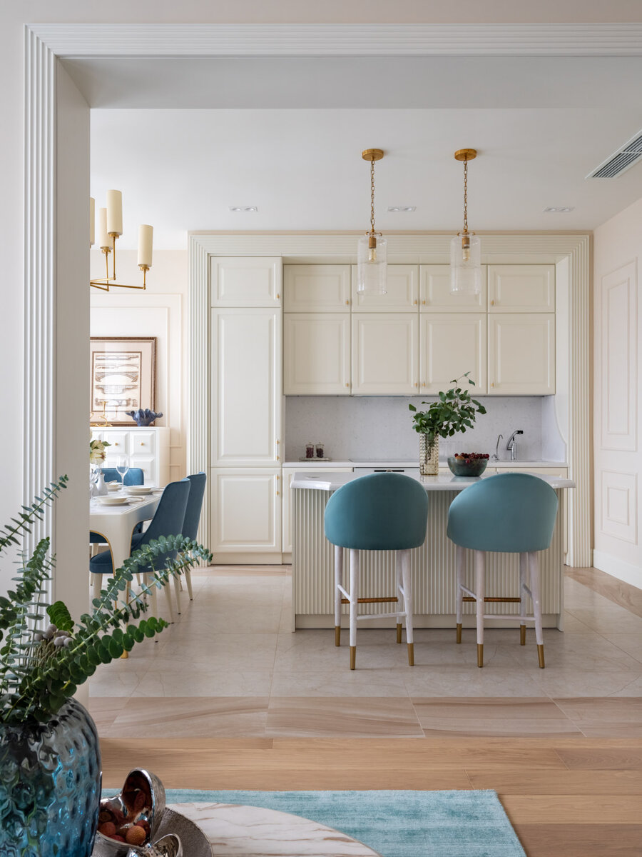 В проекте квартиры для трех женщин, бабушки, мамы и дочки, за основу были взяты светлые сливочные оттенки, а в роли яркого акцента выступил цвет Тиффани, который нравился хозяйкам.